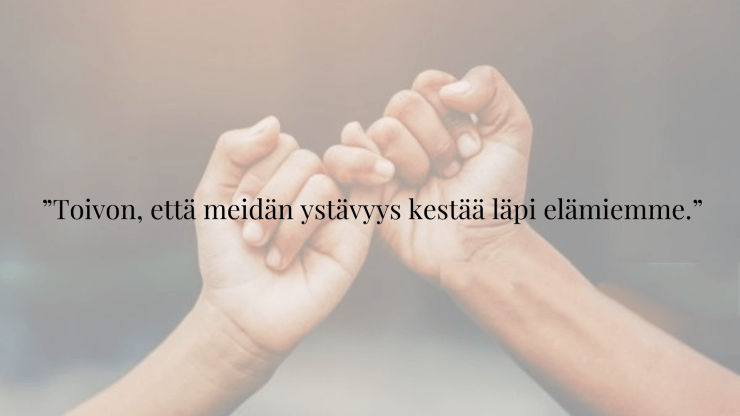 Siitä ystävyydestä mä olen todella kiitollinen. Tiedän, että voin milloin tahansa pyytää sulta apua ja toivon, että sä tunnet samoin.
